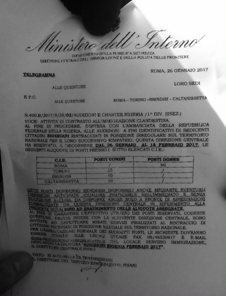 Questi posti dovranno essere utilizzati per identificare “sedicenti cittadini nigeriani rintracciati in posizione irregolare sul territorio nazionale e per il loro successivo rimpatrio”. Le questure sopra indicate “sono invitate ad effettuare mirati servizi finalizzati al rintraccio di cittadini nigeriani in posizione illegale sul territorio nazionale”.
