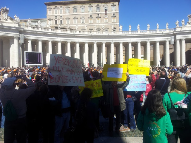 Sit-in a Piazza San Pietro per la pace in Yemen, organizzata da Rete No War a piazza San Pietro, al momento dell’Angelus, il 26 marzo 2017, in contemporanea con un’enorme manifestazione nella capitale yemenita Sana’a e in diverse città del mondo.