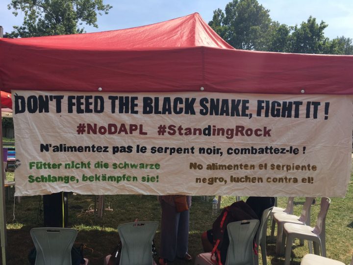 E’ poi intervenuto il giovane rapper Rafael Gonzalez alias Tufawon, uno dei protettori dell’acqua che stanno girando l’Europa in queste settimane per promuovere la campagna di disinvestimento e rafforzare i legami con gruppi e movimenti di vari paesi, che ha parlato in inglese con l’ottima traduzione di Carla Agrario. In prima linea per mesi nella resistenza di Standing Rock, dopo lo sgombero forzato dell’Oceti Sakowin Camp, in febbraio, si è dedicato alla campagna #DefundDAPL e alla lotta contro altri oleodotti. Rafael si è poi soffermato sul ruolo cruciale svolto dai social media e dai media indipendenti per sostenere lotte come quella dei nativi americani e ha ricordato i coraggiosi giornalisti in prima linea a Standing Rock insieme agli attivisti, fondamentali per testimoniare ciò che stava succedendo. Si è costruita così una rete di appoggio reciproco, con informazioni, live streaming e video condivisi in grado di raggiungere moltissime persone. Una vera minaccia per la lobby dell’informazione e per le corporazioni, che infatti stanno mettendo in campo le loro potenti risorse per ostacolare le trasmissioni live. Un obiettivo di fondamentale importanza diventa dunque quello di trovare forme tecnologiche avanzate per sventare questo tentativo. Studiare questi metodi alternativi per poter continuare la lotta può essere una buona idea anche per altri movimenti, ha osservato il giovane protettore dell’acqua.