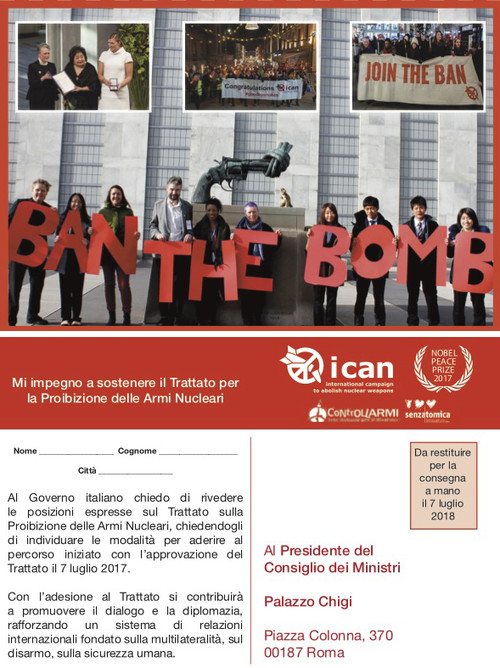 Questa nuova fase di azione prevede la distribuzione su tutto il territorio nazionale di cartoline che i cittadini potranno sottoscrivere e che verranno poi indirizzate al Presidente del Consiglio del prossimo Governo, qualunque sarà dopo l’esito delle Elezioni politiche del 4 marzo, per far cambiare idea al nostro Paese ed allineare anche l’Italia alla volontà di disarmo nucleare espressa dalla maggioranza degli Stati parte delle Nazioni Unite.