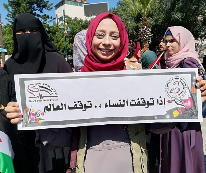 Nei bei giardini Al Jundi Majhul nel centro di Gaza city, sotto un sole generoso che fa già primavera, il 10 marzo si sono riunite circa duecento  donne e a loro si sono uniti una ventina di uomini per riaffermare, insieme, i temi che l’8 marzo pone in maggior evidenza. La manifestazione, fatta volutamente il 10 per non confliggere con altre, è stata organizzata dall’associazione AISHA, che ha come proprio focus la protezione delle donne e dell’infanzia.