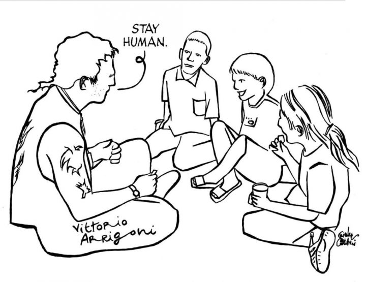 Per ‘restare umani’, non perdere il contatto con la propria umanità e con il senso di giustizia che la battaglia per i diritti umani e per la libertà del popolo palestinese porta con sé, per restare in contatto con se stessi, e non lasciarsi tramutare in abulici, apatici e indifferenti esseri viventi e portare avanti quella coerente battaglia di testimonianza e informazione che chi ha ucciso Vik ha voluto colpire.