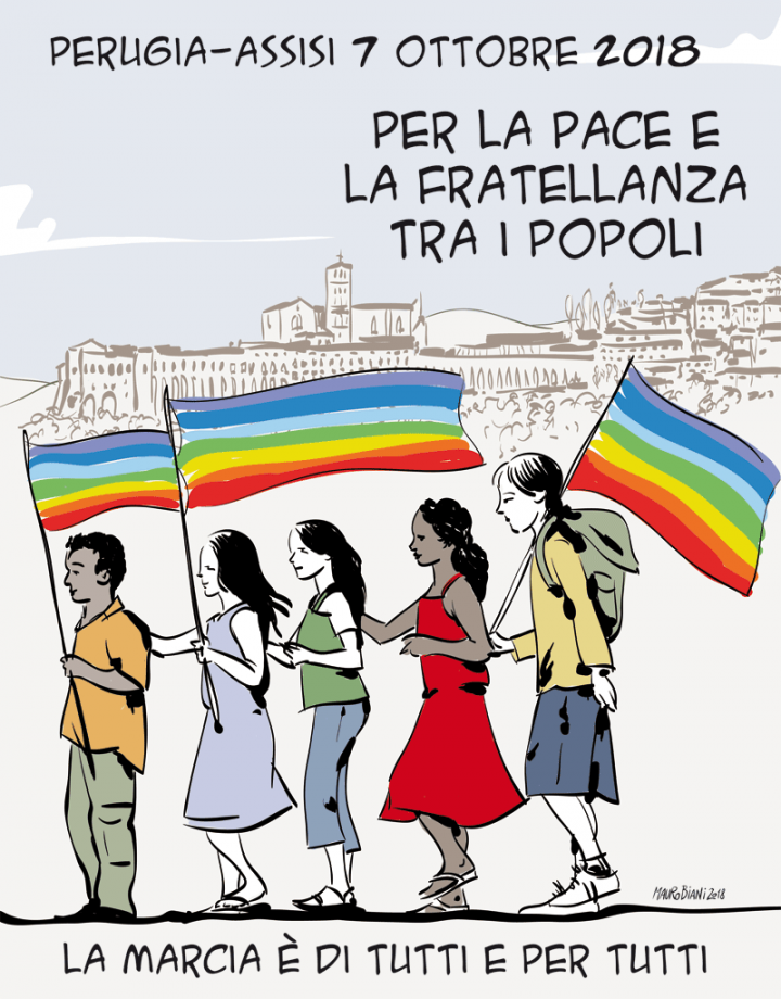 Oggi la politica fomenta l’odio, il governo incita il cittadino alla difesa armata fai-da-te. L’alternativa a questo precipizio di civiltà è il disarmo: disarmare il pensiero, disarmare le parole, disarmare le azioni. La nonviolenza è la risposta necessaria, capace di moltiplicare gli anticorpi che possono prosciugare il brodo di coltura nel quale stanno proliferando i batteri dell’ignoranza, dell’egoismo, del fascismo. La Marcia Perugia-Assisi del 2018 può essere la prima risposta forte, corale, di tutti, al governo che calpesta i diritti e promuove la xenofobia. A chi sparge odio e paura rispondiamo con il coraggio della resistenza civile. A chi innalza muri e ripristina confini rispondiamo con la fratellanza tra i popoli.