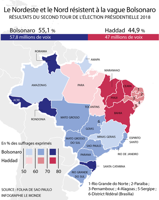 “Tutto il sud e l’ovest del paese, parte del Brasile con un reddito pro capite più elevato e una densità abitativa inferiore, ha votato a favore del candidato di estrema destra [le parti in blu della mappa]. Si noti, a riguardo, il risultato negli Stati occidentali della Rondoina e del Mato Grosso, principali aree di deforestazione del paese. Dato ancora più vero e confermato nel sud-est del Paese, negli stati di Rio de Janeiro, San Paolo, Espirito Santo e Minas Gerais: questi quattro stati producono circa il 60% del PIL del Brasile e sono popolati prevalentemente da bianchi, che rappresentano il 55% della popolazione, stando al censimento dell 2010, poco più della media del 47% del Brasile nel suo complesso”. fa notare il famoso quotidiano francese.