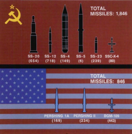 Il Trattato sulle forze nucleari a medio raggio (INF) del 1987 fu negoziato da Ronald Reagan e Mikhail Gorbaciov. L’INF richiedeva agli Stati Uniti e all’Unione Sovietica di eliminare e rinunciare definitivamente a tutti i loro missili balistici e da crociera, nucleari e convenzionali, lanciati a terra con una portata di 500-5.500 chilometri. Il trattato ha sancito per la prima volta il fatto che le superpotenze abbiano accettato di ridurre i loro arsenali nucleari, di eliminare un’intera categoria di armi nucleari e di effettuare ampie ispezioni in loco per la verifica. Come risultato del trattato INF, gli Stati Uniti e l’Unione Sovietica distrussero un totale di 2.692 missili a corto, medio e medio raggio entro il termine di attuazione del trattato del 1° giugno 1991.