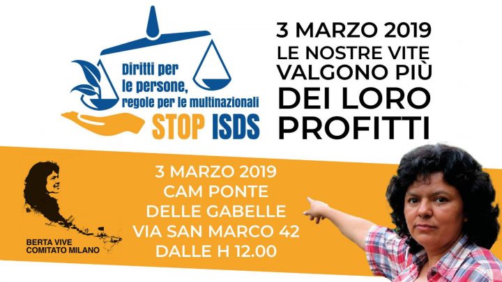 La campagna Stop Ttip Milano insieme al Comitato Berta Vive Milano, e con la partecipazione del Comitato Acqua Pubblica e del Collettivo Donne Latinoamericane Marielle Franco vi invita alla giornata di lancio della campagna “Diritti per le persone, regole per le multinazionali: Stop ISDS”.