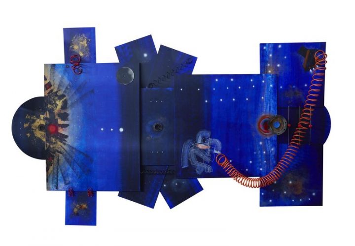 Dove vai (uomo)? Si è chiesta l’artista e con i suoi strumenti ha cercato una risposta. Nell’immenso universo in espansione rappresentato da colori che ti tolgono il respiro per l’intensità dei toni, si scorge un piccolo uomo, un astronauta che appare quasi un arché ologrammatico ed allo stesso tempo l’uomo del futuro in esplorazione del cosmo. Un uomo legato attraverso un cordone ombelicale realizzato con una spirale, come quelle in uso dai gommisti, capace di significare il soffio vitale, la Psiché greca. Una spirale che, nel suo significato più immediato, simboleggia il bisogno umano di un legame vitale e tecnologico, come quello del bambino con i genitori, e che qui, superando il rapporto triadico, diventa un collegamento collettivo con il buco nero, fonte di energia inesauribile. L’uomo è un granello di sabbia in relazione al Cosmo e per vivere ha bisogno di una dipendenza: nonostante tutti gli sforzi non potrà mai essere completamente libero. Quo vadis è un’opera imponente non solo per le sue dimensioni (300×500, tecnica mista) ma anche perché si impone all’attenzione di chi la osserva catturando nel suo ondeggiare, nonostante sia immobile dà l’impressione di muoversi in volo, sull’astronave del futuro: là dove l’uomo per sopravvivere rispettando ecologicamente l’universo dovrà ridurre la sua onnipotenza narcisistica. Ce la farà? Questo l’ottimismo dell’opera della Giordano che dopo aver analizzato il presente sa prevedere un ambiente umano e cosmico più rispettoso della vita e dell’integrità di tutto il sistema.