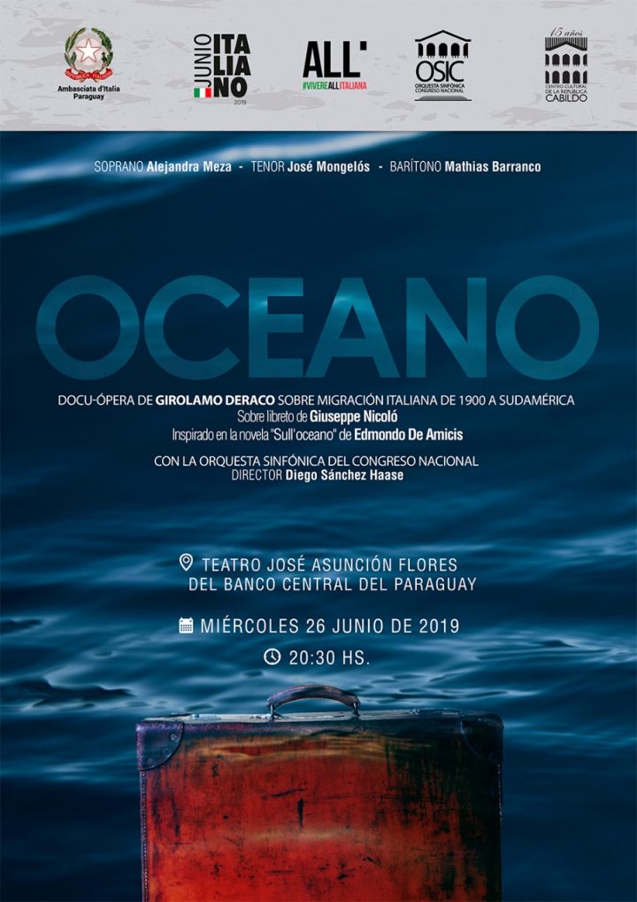 Tra le iniziative più prominenti del “Junio Italiano”, rassegna promozionale realizzata dall’Ambasciata d’Italia in Paraguay nel segno della Festa della Repubblica, e giunta quest’anno alla terza edizione, vi sarà, il prossimo 26 giugno, la prima mondiale dell’opera lirica “Oceano”, del compositore italiano Girolamo Deraco, con libretto di Giuseppe Nicolò. L’opera è liberamente ispirata al romanzo “Sull’Oceano”, di Edmondo de Amicis, e narra il viaggio verso il Sud America di un gruppo di emigranti italiani alla fine del secolo XIX. Si tratta di un grande progetto, in cui si celebra l’epopea dell’emigrazione italiana in Sud America e in Paraguay in particolare.