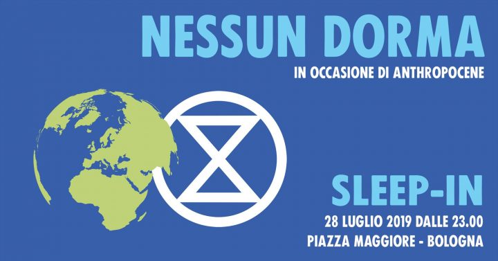 Il gruppo di Extinction Rebellion Bologna organizza, in occasione della proiezione in Piazza Maggiore del documentario “Antropocene”, il 28 luglio, una giornata di riflessione e uno sleep-in nella piazza simbolo di Bologna. L’obiettivo dell’evento è quello di sensibilizzare i cittadini bolognesi sull’emergenza climatica in atto e spiegare le nostre richieste alla cittadinanza, utilizzando tecniche partecipative.