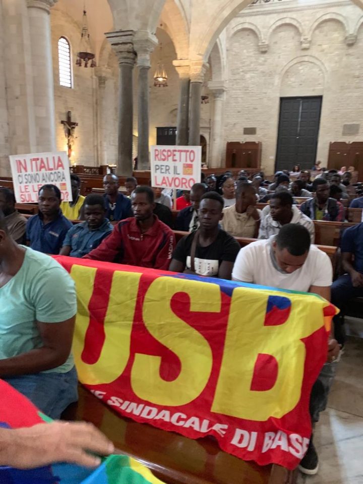 Questa mattina poco dopo le 11 una folta delegazioni di braccianti della provincia di Foggia ha occupato simbolicamente la Basilica di San Nicola a Bari. L’iniziativa si inserisce nel più ampio percorso di lotta dei braccianti che vivono nei ghetti del territorio foggiano. Da anni questi uomini e queste donne reclamano soluzioni concrete alla situazione di illegalità in cui sono costretti a lavorare e a sopravvivere. Una richiesta di rispetto dei diritti per contratti regolari di lavoro, per il rilascio dei documenti e l’utilizzo di mezzi sicuri di trasporto, per il riconoscimento della dignità, del diritto alla casa e alla tutela della propria salute.
