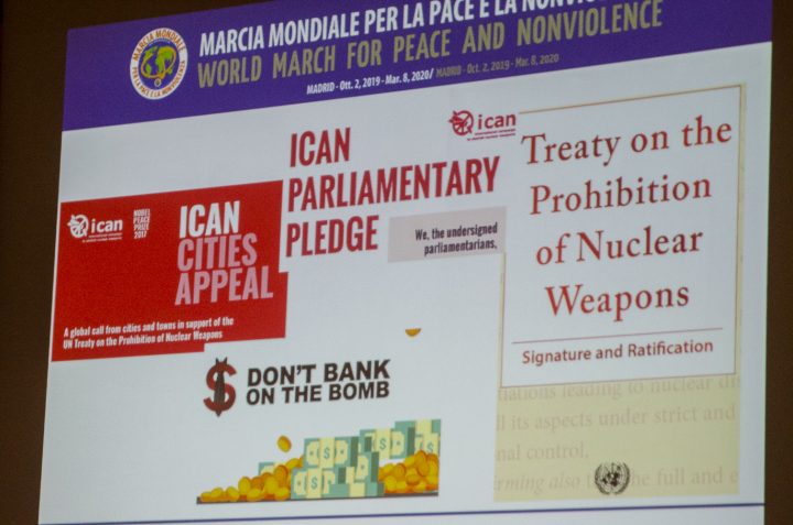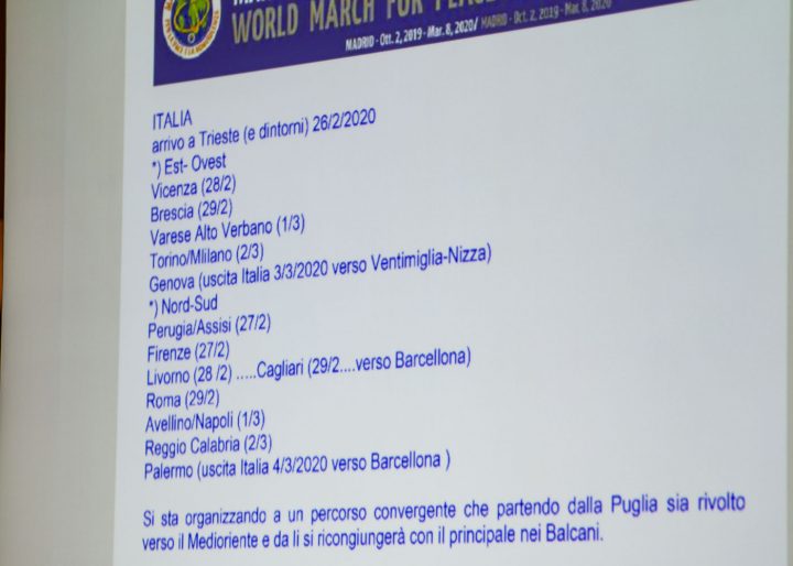 Tiziana Volta, coordinatrice del Comitato promotore italiano della Marcia, descrive brevemente il percorso che toccherà l’Italia alla fine del febbraio 2020, dividendosi poi in vari tronconi secondo una direttiva nord-sud e est-ovest. Tante le iniziative previste in varie città italiane, tra cui quella di “Mediterraneo mare di pace” con una conferenza sui rifugiati che probabilmente si terrà a Palermo.