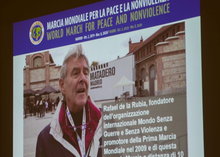 Dopo la breve introduzione di Silvio Bruschi, responsabile per l’Italia della diffusione del documentario, Rafa de la Rubia, promotore della Prima Marcia Mondiale per la Pace e la Nonviolenza e ora anche della seconda, illustra le tematiche che si sono aggiunte a quella centrale del disarmo, come i diritti umani (con particolare attenzione al tema drammatico dei rifugiati), l’ambiente, la non discriminazione e la necessità di rifondare l’ONU. Questa volta la marcia toccherà anche l’Artico e l’Antartico e vedrà durante il suo percorso conferenze e iniziative capaci di coinvolgere le nuove generazioni e di mobilitare le coscienze.