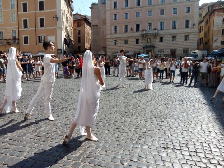 E’ seguito il balletto di danza classica dei giovani dell’accademia diretta da Paola Iorio sulle note dell’Ave Maria di Gounod. E’ un momento pazzesco, di grande energia e commozione, davanti al Pantheon un rito tutto in bianco, con adolescenti flessuosi che parlano con la danza…e anche quest’anno la coreografia si conclude con una bambina sollevata in alto con nelle manine una Colomba della Pace. I visi sono rossi e c’è chi piange. Hanno messo la coca cola sotto le scarpine dice Paola Iorio, per non scivolare sui sanpietrini della piazza.