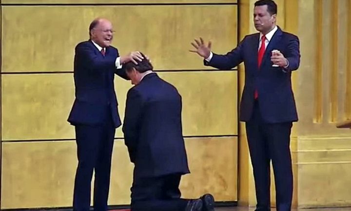 Mentre l’Amazzonia continua a bruciare, mentre la gente muore di morbillo il presidente Bolsonaro inginocchiato sull’altare riceve atteaverso le mani di Edir Macedo, il leader della più influente setta evangelica brasiliana, l’unizone del re Davide, proprio come accadde nei tempi biblici a Gerusalemme.