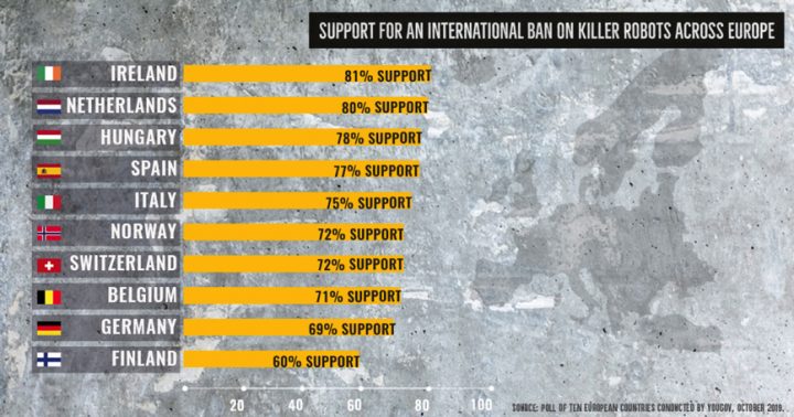 Il 73% degli intervistati da YouGov (in un sondaggio per la “Campaign to Stop Killer Robots” in 10 differenti Paesi europei vuole che i propri governi “lavorino per un divieto internazionale sui sistemi letali di armi autonome (LAWS)”. Solo il 13% degli intervistati si dice contrario a tale divieto.