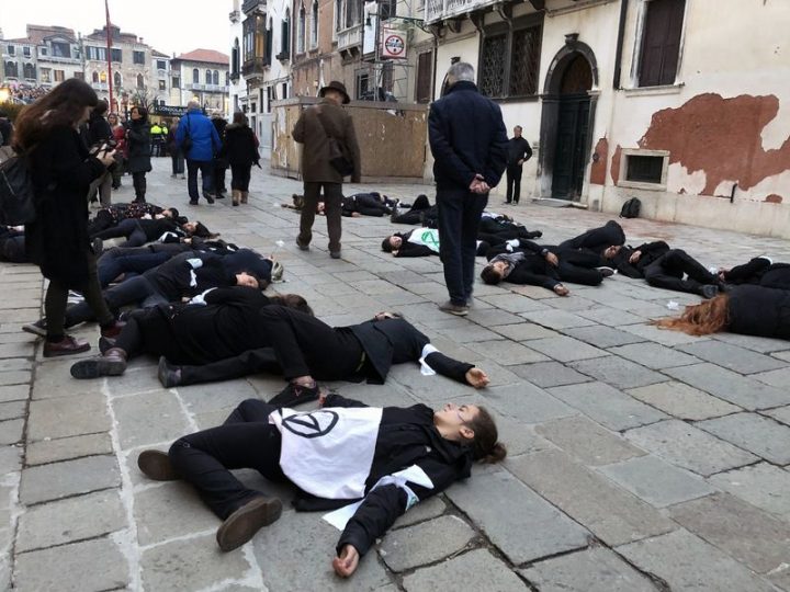 Nel pomeriggio di oggi, 21 novembre 2019, Extinction Rebellion Venezia ha tenuto un flash mob davanti al ponte votivo che porta alla Basilica della Salute a Venezia. L’evento è stato organizzato per richiedere al sindaco, Luigi Brugnaro, di procedere urgentemente alla Dichiarazione di Emergenza Ecologica e Climatica. Una quarantina di persone si sono immobilizzate davanti al ponte votivo, attirando l’attenzione dei passanti. Infine il gruppo si è disteso per terra all’unisono, a rappresentare la fine collettiva che ci aspetta se non affrontiamo questa crisi: siamo in emergenza e questa non è un’esercitazione.