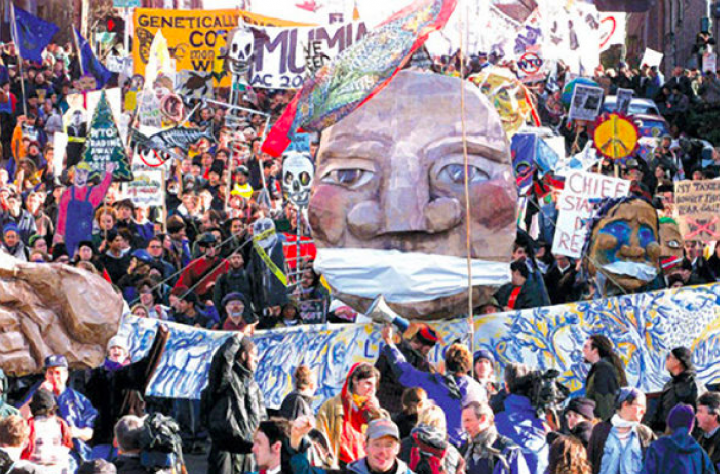 Un grande mondo colorato, trascinato da metalmeccanici e ambientalisti. Poi uno strappo, e dal lato un turbine di farfalle nel cielo freddo del 30 novembre a Seattle. È una delle immagini più simboliche della battaglia per il pianeta combattuta da oltre 50 mila attivisti, indigeni, femministe, contadini e lavoratori che, in questi giorni di venti anni fa, bloccavano il vertice dell’Organizzazione Mondiale del Commercio.