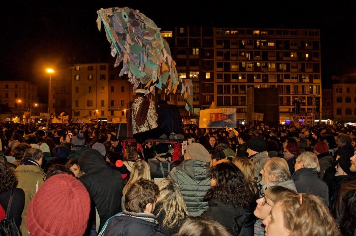 La manifestazione è stata anche trasmessa sulla emittente regionale TRC e in streaming web sul sito delle Sardine (6000sardine). In piazza all’inizio hanno suonato i percussionisti del gruppo Marakatimba; dalle 15.45 sul palco le band Malavoglia, Altre di B, Joycut, Rumba De Bodas, intervallate dagli interventi dello chef Mario Ferrara e dell’attrice Matilda De Angelis. Dalle 17 hanno suonato gli Skiantos, Casa del Vento, Bandabardò e i Modena City Ramblers, che hanno trascinato la piazza in particolare con le loro canzoni contro la mafia; poi gli interventi dell’economista Fabrizio Barca e Sandro Ruotolo. Dalle 18.15 il Terzo segreto di satira, i Marlene Kuntz, il cantautore Vasco I Brondi; interventi di Pif, Moni Ovadia e dell’associazione bolognese di volontariato Vicini d’Istanti, che occupa vari migranti nella creazione di abbigliamento con tessuti africani e realizza anche ‘sardine’ di stoffa, molto vendute in piazza. Poi l’attore Alessandro Bergonzoni, Afterhours, Subsonica e i rapper Willie Peyote e Marracash. Intervenuti anche Francesco Guccini ed Ezio Bosso, solo in video, ma applauditissimi dalla piazza.