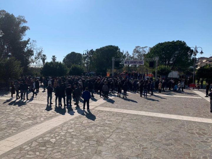 Mi è tornato in mente quest’episodio di tre anni fa in relazione alla visita a Riace di Matteo Salvini venerdì 17 gennaio, in vista delle prossime elezioni regionali. Il contesto è ovviamente diverso, sono passati tre anni e sappiamo tutti com’è andata a finire l’accoglienza a Riace. Sono arrivati i decreti sicurezza che hanno di fatto smantellato l’accoglienza diffusa in tutta Italia, sappiamo che Domenico Lucano è sotto processo. Eppure, questa volta, come tre anni fa ci sono molte similitudini. Innanzi tutto era stato annunciato l’arrivo di Salvini nel borgo antico, nella piazza dei Bronzi che sarebbe la piazza del municipio, la stessa della manifestazione di Forza Nuova. All’ultimo momento c’era stato però un cambio di sede: l’evento si sarebbe svolto nella piazza antistante il passaggio a livello, alla Marina. Per chi non è mai stato a Riace, è utile sapere che Riace borgo, cuore dell’accoglienza dove il modello Lucano ha avuto massima espressione, dista ben sette chilometri da Riace marina. Tra borgo e marina c’è sempre stata una forte distinzione: nel borgo, alle ultime elezioni comunali, la lista Il cielo sopra Riace della formazione di Lucano ha vinto. Antonio Trifoli, attuale sindaco eletto e poi ritenuto ineleggibile, ha vinto invece grazie al voto dei residenti alla marina. Salire al borgo era probabilmente troppo rischioso per il ritorno d’immagine del Capitano, sicuramente l’episodio di Forza Nuova non sarà passato inosservato. Si è deciso così per la Marina e come tre anni fa, le forze di polizia non sono mancate, si calcola fossero presenti circa cinquanta divise, e come allora anche molti, moltissimi giornalisti e sempre come allora veramente poca gente. Il sindaco (abusivo) di turno, Antonio Trifoli, tra frasi sgrammaticate, sorrisi di circostanza, dichiara che voterà Lega, Salvini replica che quando sarà primo ministro, chiuderà i porti. Fine della farsa, riparte il tour del Capitano, si smonta il palco mentre al borgo superiore, si canta e si balla. Le immagini, se messe a confronto, stridono: dal grigiore monocolore delle divise dei militari presenti al comizio alla Marina, all’arcobaleno sorridente dei bimbi al borgo, ai volti accigliati e carichi di odio dei Salvini boys, alle risa spontanea della gente e di Domenico Lucano che gioca con i bambini.