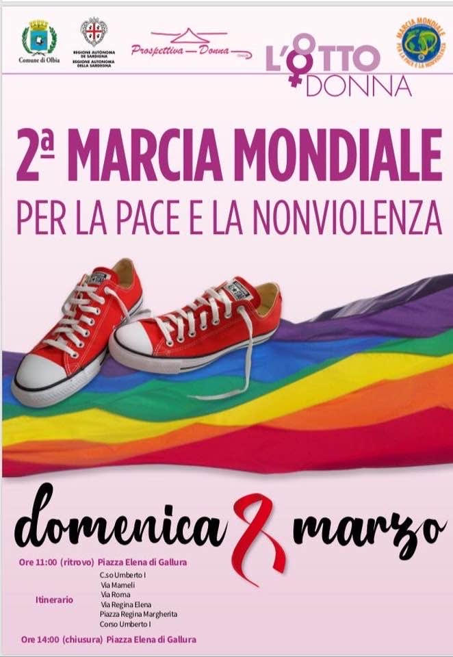Domenica 8 marzo 2020 in piazza Elena di Gallura alle 11 prenderà il via la manifestazione pubblica organizzata dal gruppo promotore di Olbia della Seconda Marcia Mondiale per Pace e la Nonviolenza e da Prospettiva donna, che insieme sostengono e diffondono la cultura della nonviolenza e di un mondo senza guerre, privilegiando il dialogo in qualsiasi forma e manifestazione.