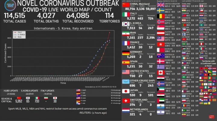 Stando alla mezzanotte del 9 marzo, l’Iran è il quarto paese (dopo Cina, Italia e Corea del Sud) per numero di morti da COVID-19. La curva temporale dei casi confermati non ha ancora preso la tipica forma a S come per la Corea del Sud, un segno del successo delle misure di contenimento dell’epidemia. [vedi immagine, fonte aggregata da Roylab Stats, Corea del Sud] L’Italia è ancora molto lontana.