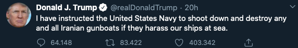 Ma il nuovo tweet di Donald Trump, “Ho dato l’ordine alla marina militare statunitense di colpire e distruggere ogni nave iraniana che interferisca con le nostre navi”, sebbene possa fare molta paura, non significa praticamente nulla.
