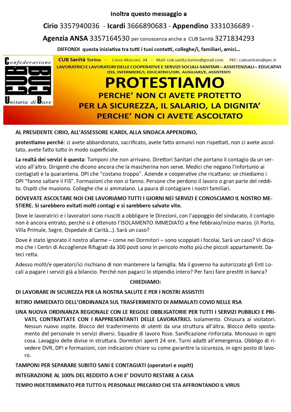 Il CUB (Comitato Unitario di Base) Sanità di Torino presenta una piattaforma di protesta.
