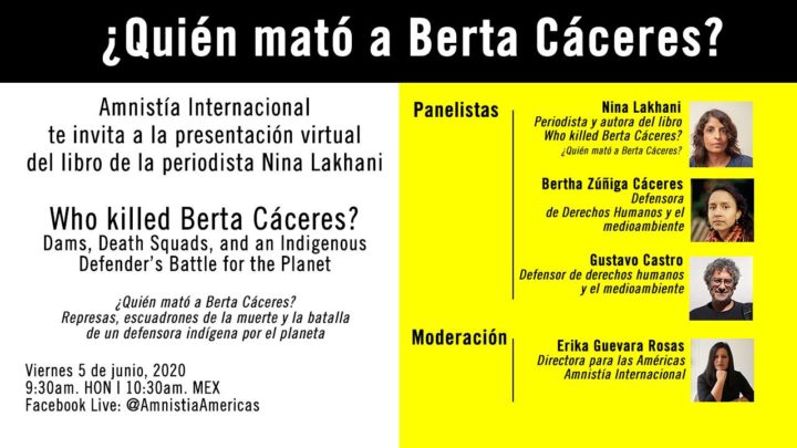 Venerdì 5 giugno 2020 alle 17.30 (ora italiana) Amnistía Internacional Américas organizza una diretta Facebook con la giornalista Nina Lakhani, autrice del libro: “¿Quién mató a Berta Cáceres? Presas, escuadrones de la muerte y la batalla de una defensora indígena por el planeta” (Chi ha ucciso Berta Cáceres? Dighe, squadroni della morte e la battaglia di una difensora indigena per il pianeta).
