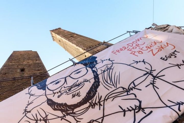 Ancora una volta Bologna chiede libertà per Patrick Zaki e lo fa dal cuore della città: la torre Garisenda. Il cartellone con l’immagine ideata dall’artista Gianluca Costantini è visibile da questa mattina su un ponteggio allestito nell’ambito del cantiere per i lavori di consolidamento della torre che si trova nel cuore della città, a pochi passi da piazza Maggiore dove il cartellono per Zaki era stato precedentemente esposto.