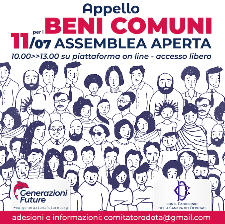 Sabato 11 luglio 2020 dalle ore 10:00 alle ore 13:00 si svolgerà l’Assemblea aperta “Appello per i Beni Comuni”, la quinta di un ciclo di incontri pubblici per la costruzione e la diffusione di una visione dei Beni Comuni così importante e strategica per il Paese.