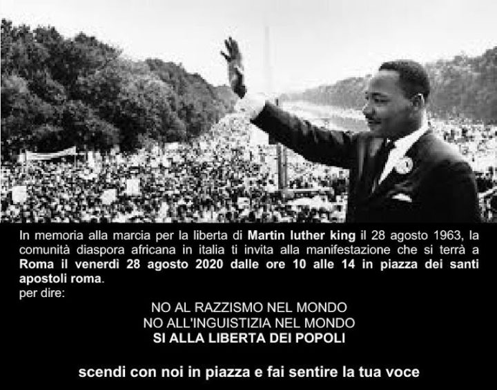 La grande manifestazione di Roma è concomitante con la grande marcia dei neri e nere degli Stati Uniti d’America che si svolgerà a Washington il 28 agosto 2020.