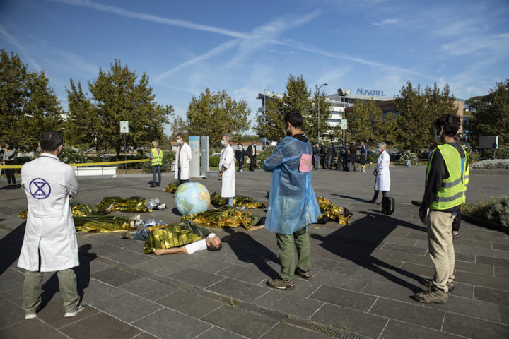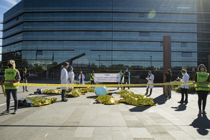 Un die-in ha simboleggiato lo scenario di morte causato dall’aggravarsi della crisi ecologica e climatica: solo i medici sono rimasti in piedi, in camice bianco, aggirandosi intorno a un pianeta Terra bisognoso di cure, intorno a corpi distesi sotto coperte termiche ormai inutili.
