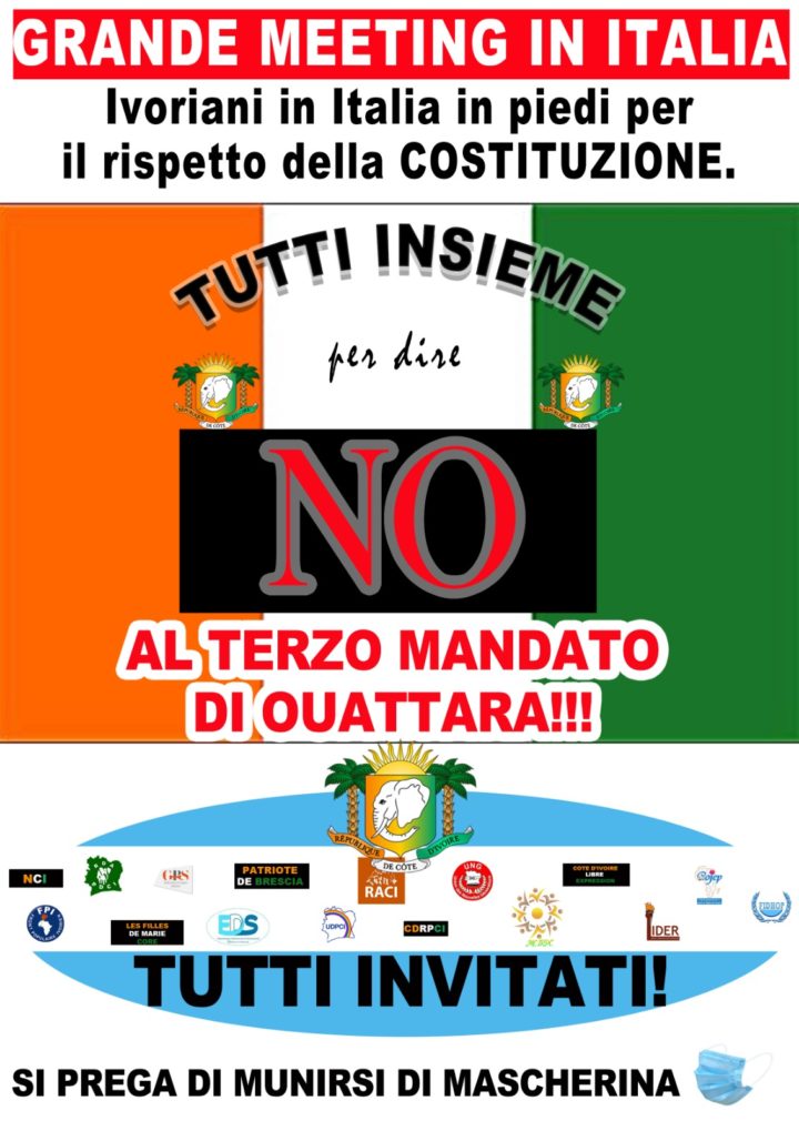1. Alla comunità internazionale, riunitasi questo sabato 5 settembre 2020 a Milano per riflettere su come agire sulla grave crisi pre-elettorale in corso in Costa d’Avorio, crisi precipitata in seguito della candidatura illegale di Alassane Dramane Ouattara per un terzo mandato.