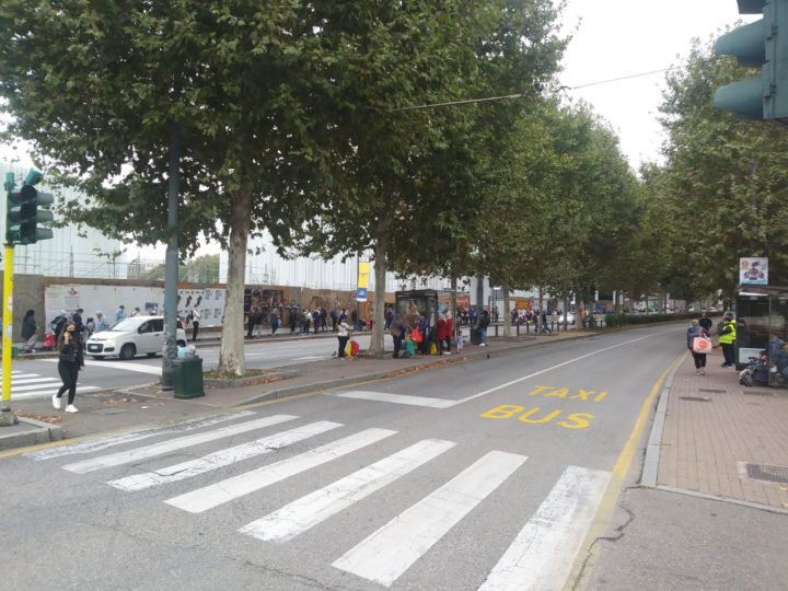 Oggi vorrei essere un fotografo e raccontarvi meglio quello che si vede, perché SI VEDE. Vi chiedo quindi di accontentarvi di questa misera foto che ho fatto. Ogni mattina lungo quel lungo muro di cinta c’è una discreta fila. Vanno tutti e tutte ordinatamente a farsi dare del cibo, sono in coda davanti al Centro Pane quotidiano. Oggi scopro che la coda è molto più lunga di prima del Covid. Lunghissima, silenziosa, paziente. Per fortuna oggi non piove.
