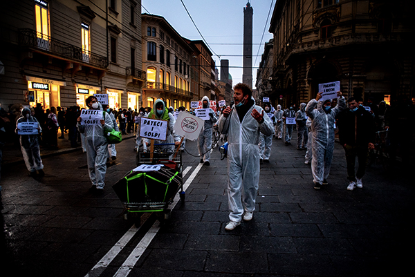 Un corteo statico di una cinquantina di attivisti di Tpo e Labas, due realtà sociali bolognesi, con le tute bianche e diversi cartelli. La scelta delle tute non sembra casuale. Infatti, gli attivisti hanno fatto ricorso all’immaginario comune di tutti noi, che associa le tute al movimento no global e ancora prima ai “disobbedienti”. Una scelta comunicativa chiara: una rivendicazione- richiamarsi al movimento dei disobbedienti, degli invisibili, precar* di un mondo globalizzato che chiedono protezione sociale- e insieme una rassicurazione rivolta alla cittadinanza “noi non siamo criminali”.