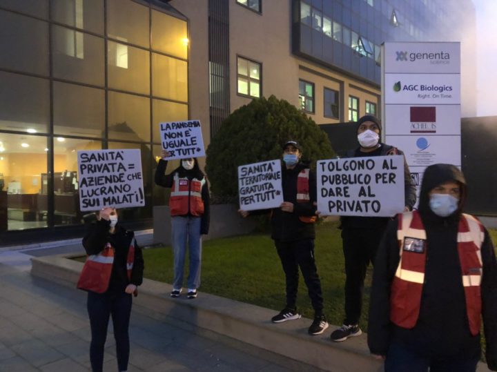 La Brigata di solidarietà popolare Milano sud ha manifestato oggi con cartelli e striscioni davanti all’Ospedale San Raffaele di Milano per denunciare come la sanità privata convenzionata tragga profitto dall’emergenza sanitaria, mentre la sanità pubblica fatica a rispondere adeguatamente ai bisogni della popolazione.