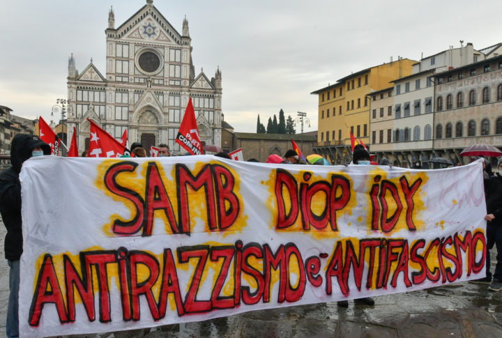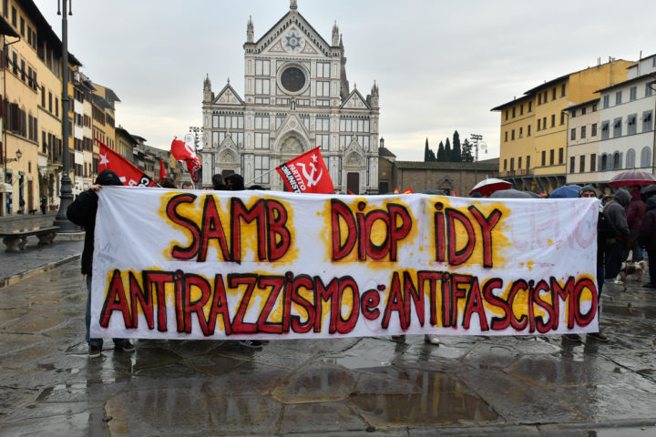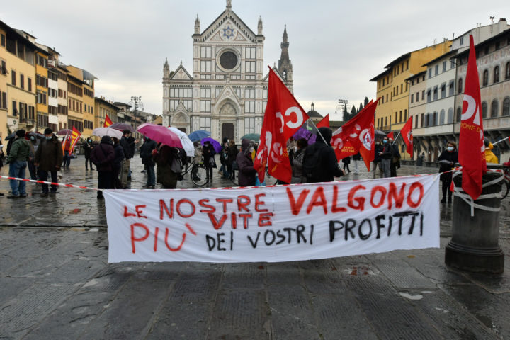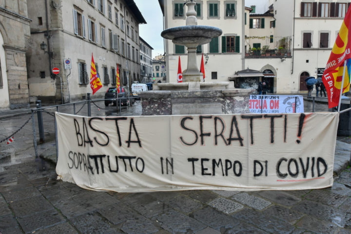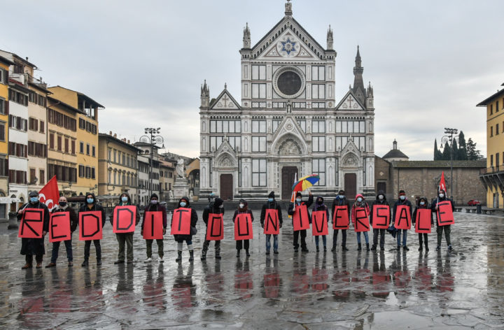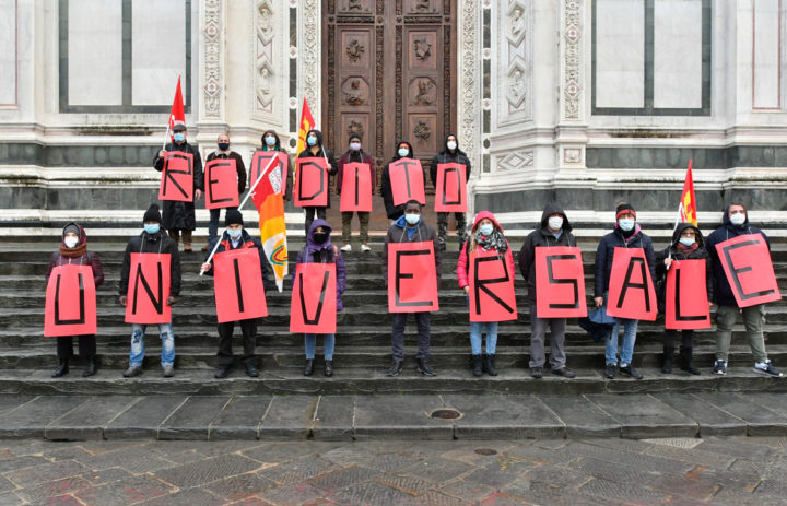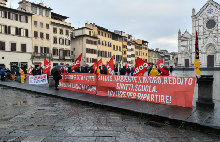 In piazza Santa Croce a Firenze presidio del sindacalismo di base, della scuola, del precariato per rivendicare un reddito universale.