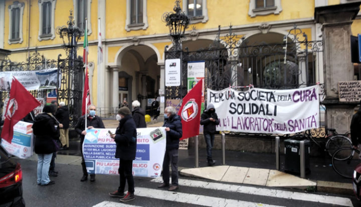 Difficile mettere insieme i lavoratori e le lavoratrici, la paura è probabilmente tanta. Così sono soprattutto militanti dai capelli grigi che non temono pioggia e freddo e che sono qui, a ricordare cosa è la giustizia, cosa sono i diritti, cos’è la salute, cos’è la sanità pubblica. Di battaglie ne hanno fatte tante, ma non cedono. Ricordano che lunedì 14 ci sarà uno sciopero presso gli ospedali San Carlo e San Paolo, due strutture che, prima del Covid, sembravano vicine alla chiusura e che invece hanno dimostrato quanto la sanità pubblica sia centrale, indispensabile.