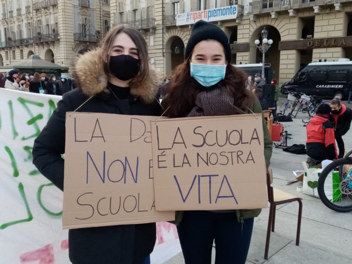Se fossi una vera giornalista non scriverei un pezzo su una manifestazione una settimana dopo della manifestazione stessa. Ma la realtà è che il pezzo non è propriamente sulla manifestazione del 9 gennaio in Piazza Castello a Torino e che, prima di essere una giornalista, sono un’insegnante, prima di un’insegnante sono una mamma, prima ancora una donna e soprattutto una persona. Allora, sapete cosa c’è? Che scrivo senza tempi perché quello che vi voglio raccontare non ha tempo, perché l’ineludibile stato d’invisibilità che hanno avuto i nostri adolescenti, da un anno a questa parte, non può essere scandito dal tempo ma deve correre davanti al tempo, deve superarlo e deve chiedergli un rimborso. Per le pagine rubate, per la conoscenza persa, per la privazione degli stimoli, delle passioni e di tutto quello che, anche se alcuni non ammetteranno mai, ha segnato un confine tra il prima e il dopo. Lunedì 18 gennaio, in Piemonte, 176 mila ragazzi torneranno a scuola alternandosi al 50% in classe fino a un massimo del 75%. «Speriamo che si riprendano quell’Isola che ‘non c’è più stata’» dice Aliza Matizen, insegnante di lingua e cultura spagnola all’Istituto d’Istruzione Superiore Marie Curie – Carlo Levi di Collegno e sostenitrice di Priorità alla Scuola. «La Scuola deve riappropriarsi di ciò che era: il luogo dove si realizzano i sogni dei giovani, la culla per eccellenza della crescita umana e culturale di cui la dad non è che un mero surrogato». Aliza ha lo sguardo della passionaria e, non a caso, mi esprime il suo pensiero mentre alle sue spalle la manifestazione indetta da Priorità alla Scuola va avanti sulle note di Edoardo Bennato proprio con il suo storico pezzo: “L’isola che non c’è“.