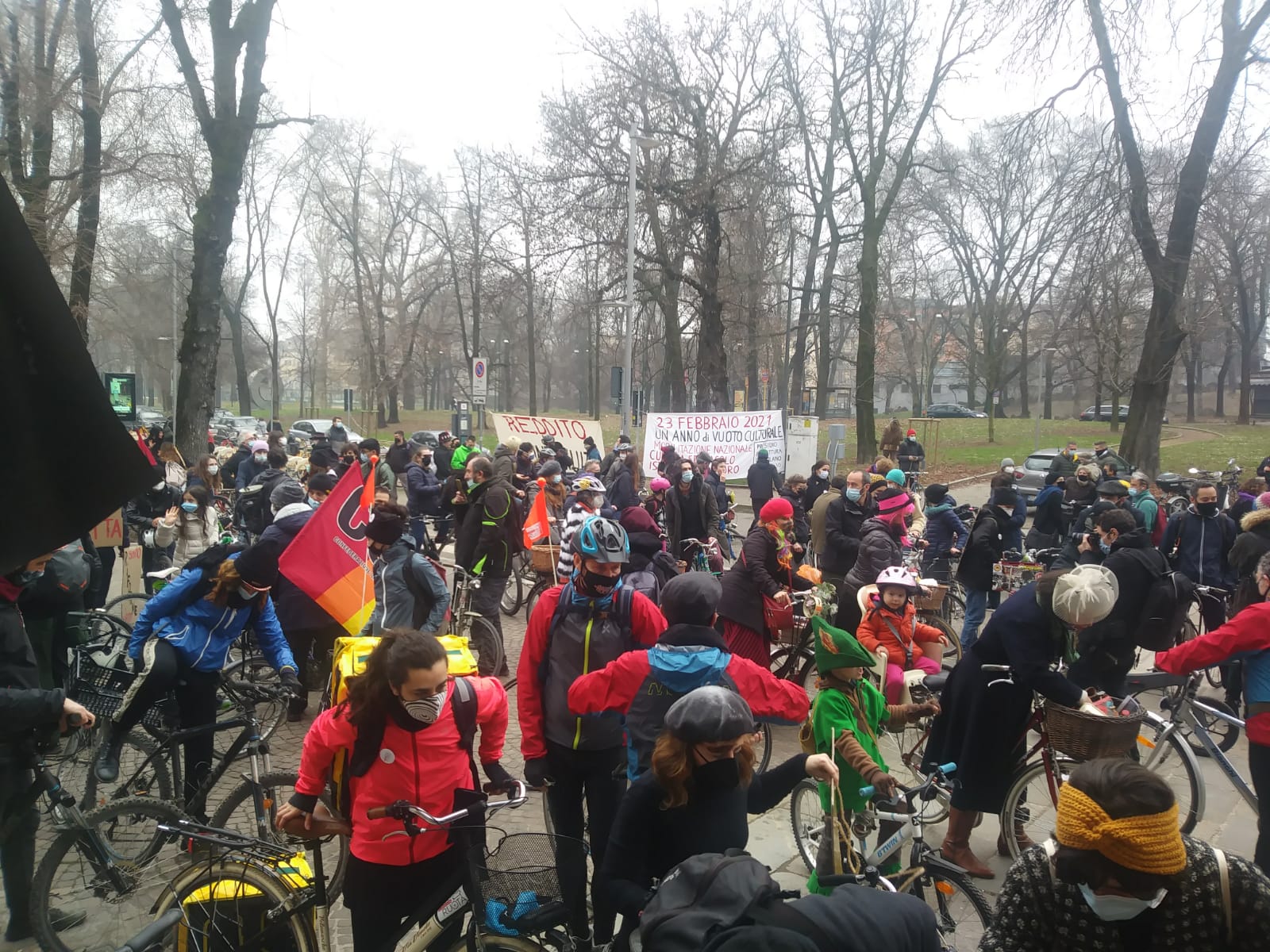 Gli automobilisti scalpitano, suonano il clacson non tanto per solidarietà, ma perché si sbrighino, si tolgano di mezzo. Loro lo ripetono: senza cultura, senza arte, la città è morta. Viene ricordato anche il rapper Pablo Hasel in carcere in Catalogna per aver sbertucciato una monarchia impresentabile, bigotta e corrotta. Si pedala, si pedala fino a Piazza Scala, esausti, infreddoliti, dopo più di tre ore di tour per la città, nei vicoli, sul pavé, tra i binari del tram.  Qualche turista in centro c’è e fotografa la massa di ciclisti, stanchi e sorridenti: qualcosa di diverso, di colorato, a Milano oggi c’è stato.