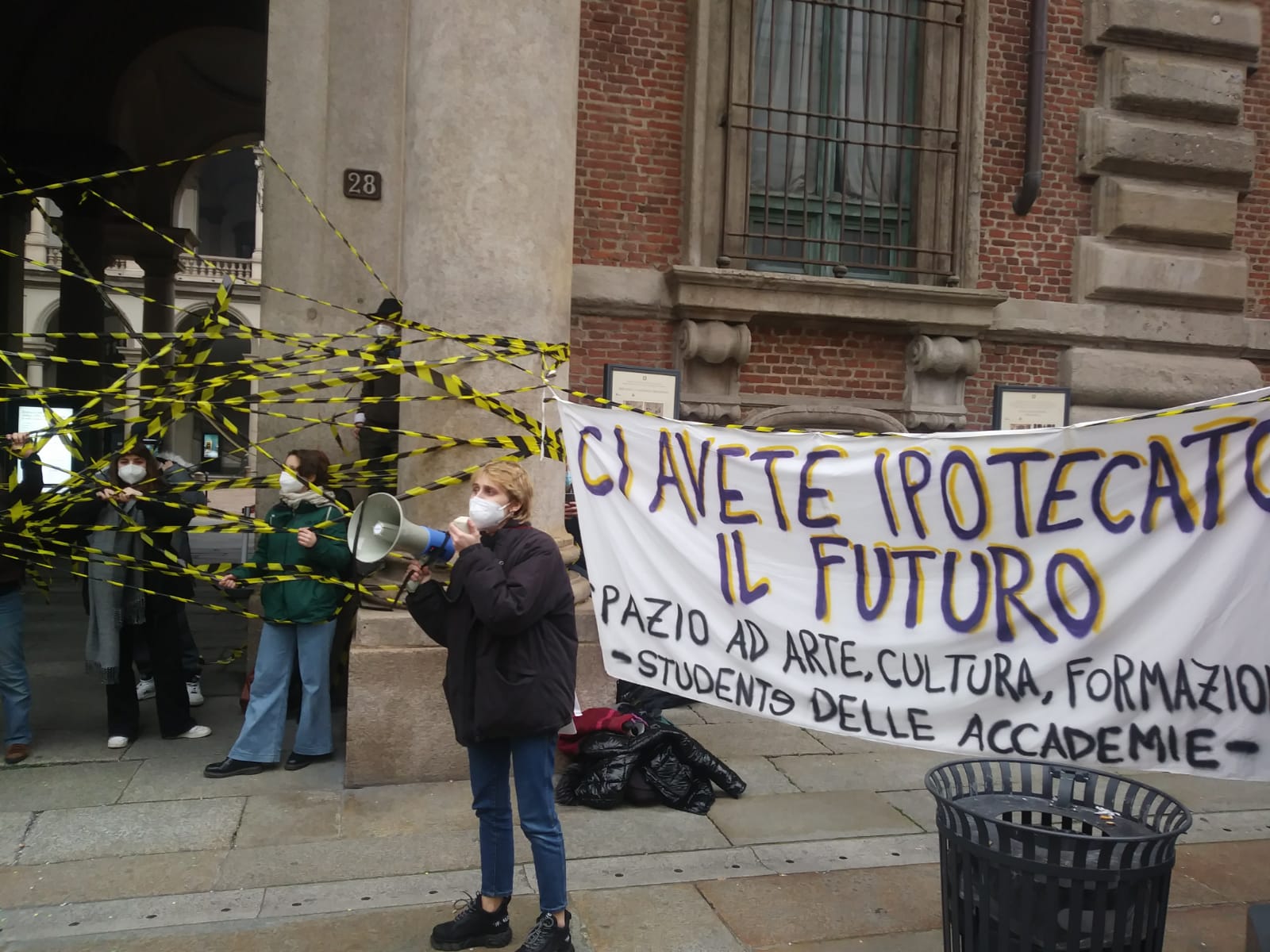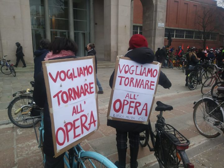 Le parole del presidio sulla sanità risuonano ancora quando nel primo pomeriggio i lavoratori e le lavoratrici della cultura si raccolgono davanti alla Triennale. Età media più bassa rispetto alla mattina. Tanti volti e abiti colorati, creativi, molti coi bambini. Una Cultural Mass, una sequenza di tappe di 2-300 persone che si spostano in bicicletta occupando per quanto possono la città, gridando a ogni angolo che la cultura non è fatta tanto dai monumenti che incrociamo, ma dalle persone che danno loro vita ogni giorno. Piccolo Teatro, Accademia di Brera, Liceo Parini, Università Statale, Teatro Lirico (vergognosamente chiuso da 20 anni!!), Biblioteca Sormani sono le tappe della biciclettata, che si conclude in Piazza Scala. Interventi in ogni luogo dove un gruppo aspetta per la sua performance o lancia il suo appello, i suoi slogan. E’ un mondo frammentato, costituito per maggior parte da precari, dove le cooperative sono definite “fatturifici”. Oggi si sono uniti artisti, attori, musicisti e tutti coloro che stanno dietro le quinte, tecnici, bibliotecari, guide nei musei, fino agli artisti di strada.