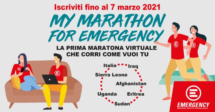 Così fino al 7 marzo 2021 EMERGENCY chiama a raccolta i maratoneti di tutta Italia, professionisti e principianti, per una corsa differente dal solito per l’emergenza Covid. Quest’anno si parteciperà, ognuno in solitaria, come si preferisce: in un parco, su strada, sul tapis roulant o anche dal divano guardando la serie preferita. Per unirsi alla grande squadra solidale che sostiene EMERGENCY e il diritto alla cura basterà iscriversi aggiungendo i propri 10 chilometri (o più) al percorso collettivo per conquistare insieme i 20.000 che intercorrono tra Sudan, Afghanistan, Italia, Iraq, Uganda, Eritrea, Sierra Leone e il diritto a cure accessibili, gratuite e di alta qualità per tutti.
