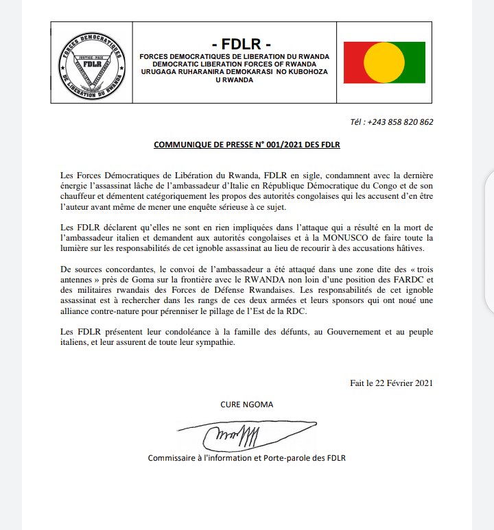 La responsabilità dell’attentato in un primo momento era ricaduta sulle Forze Democratiche della Liberazione del Ruanda (Fdlr), accusate dalle autorità congolesi di essere gli autori dell’agguato. Le Fldr però, oggi, in un comunicato ufficiale, hanno negato ogni responsabilità. Nel loro comunicato, si legge: “Condanniamo con forza l’attacco e respingiamo categoricamente le accuse delle autorità di Kinshasa” andando avanti nel comunicato dichiarano, di non essere per nulla implicati nella vicenda, chiedendo inoltre alle autorità congolesi e a Monusco di “far luce al più presto sulle responsabilità di questo ignobile assassinio.” Secondo Fdlr, l’attentato sarebbe avvenuto “non lontano da pattuglie delle forze armate della Repubblica Democratica del Congo.” Il comunicato conclude con le ”condoglianze ai familiari delle vittime, al governo e al popolo italiano”.