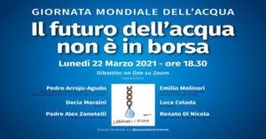 In occasione della Giornata Mondiale dell’Acqua, lunedì 22 Marzo, alle ore 18.30 il Forum Italiano dei Movimenti per l’Acqua organizza il dibattito on line “Il futuro dell’acqua non è in Borsa” a cui parteciperanno: Pedro Arrojo-Agudo (Relatore Speciale delle Nazioni … Leggi tutto Giornata mondiale dell’acqua: il futuro dell’acqua non è in Borsa
