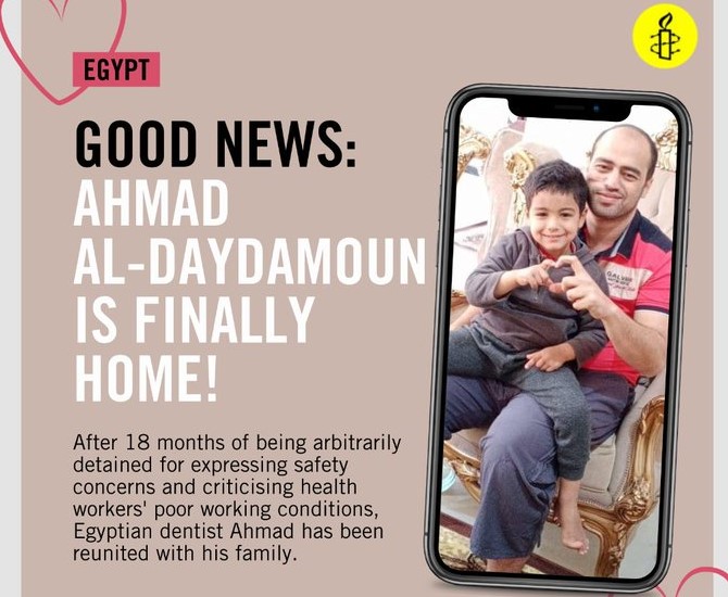 Il 29 marzo Ahmad al-Daydamoun, di professione dentista, è stato rilasciato da una prigione egiziana dopo 18 mesi di detenzione illegale senza processo.