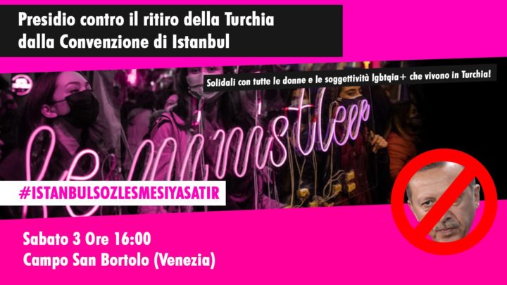 Sabato, il 3 aprile 2021, alle ore 16:00, in Campo San Bortolo a Venezia si svolgerà un presidio in solidarietà con le donne in Turchia e contro la decisione del Presidente della Repubblica che ha tirato fuori il Paese dalla Convenzione d’Istanbul. Pubblichiamo il comunicato stampa dell’iniziativa: