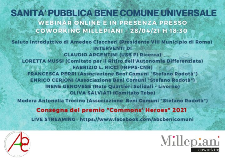 In collaborazione con il co-working Millepiani – mediapartner dell’evento – l’Associazione Beni Comuni “Stefano Rodotà” ha organizzato per il 28 aprile alle 18,30 la seconda edizione del webinar “Salute pubblica bene comune universale”, con cui prosegue la disamina dei problemi che il definanziamento per decenni della ricerca di base e del nostro sistema sanitario ha comportato, e che la pandemia ha reso drammaticamente evidente. Sarà l’occasione anche per rilanciare la petizione su “Vaccini pubblici prodotti in Italia”.