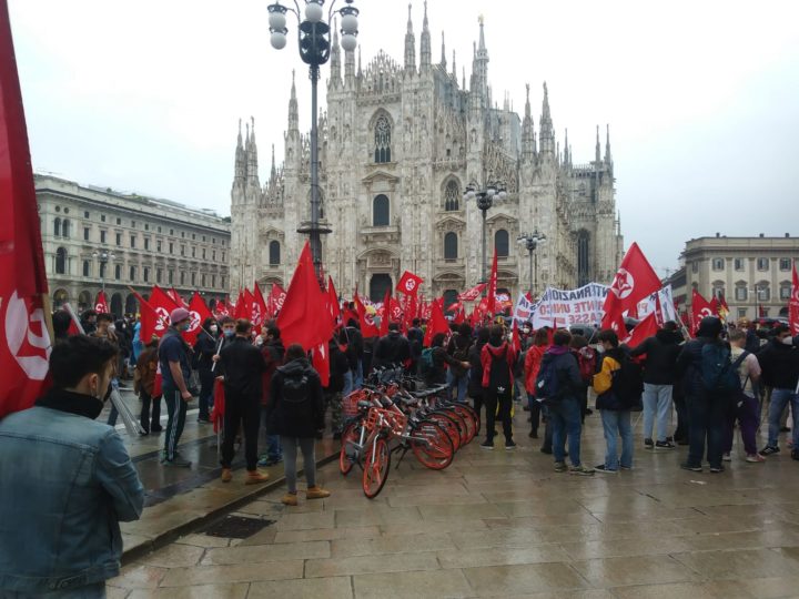 Oggi pioveva, ma è riuscita. Non solo, dopo un anno e più di presidi e presidi, si è finalmente tenuta una manifestazione autorizzata. Da piazza Cairoli a piazza Duomo, 500 metri che hanno visto sfilare tra le due e le tremila persone. Tanti striscioni, tanti ombrelli, tantissime bandiere. Sindacati di base di tutti i tipi, anarchici, Rifondazione, piccoli partiti rivoluzionari, No-Cpr, Ottoni a scoppio, Rimaflow. Trasversali a tutti una larga componente di immigrati. Erano i più arrabbiati, decisi a gridare e gridare; lavoratori soprattutto della logistica che negli ultimi anni hanno scoperto cosa vuol dire lottare, hanno conosciuto l’organizzazione, le vittorie e la repressione. E poi gli immigrati che ricordano che “non possono più aspettare”, documenti-carote mentre il bastone è sempre pronto.