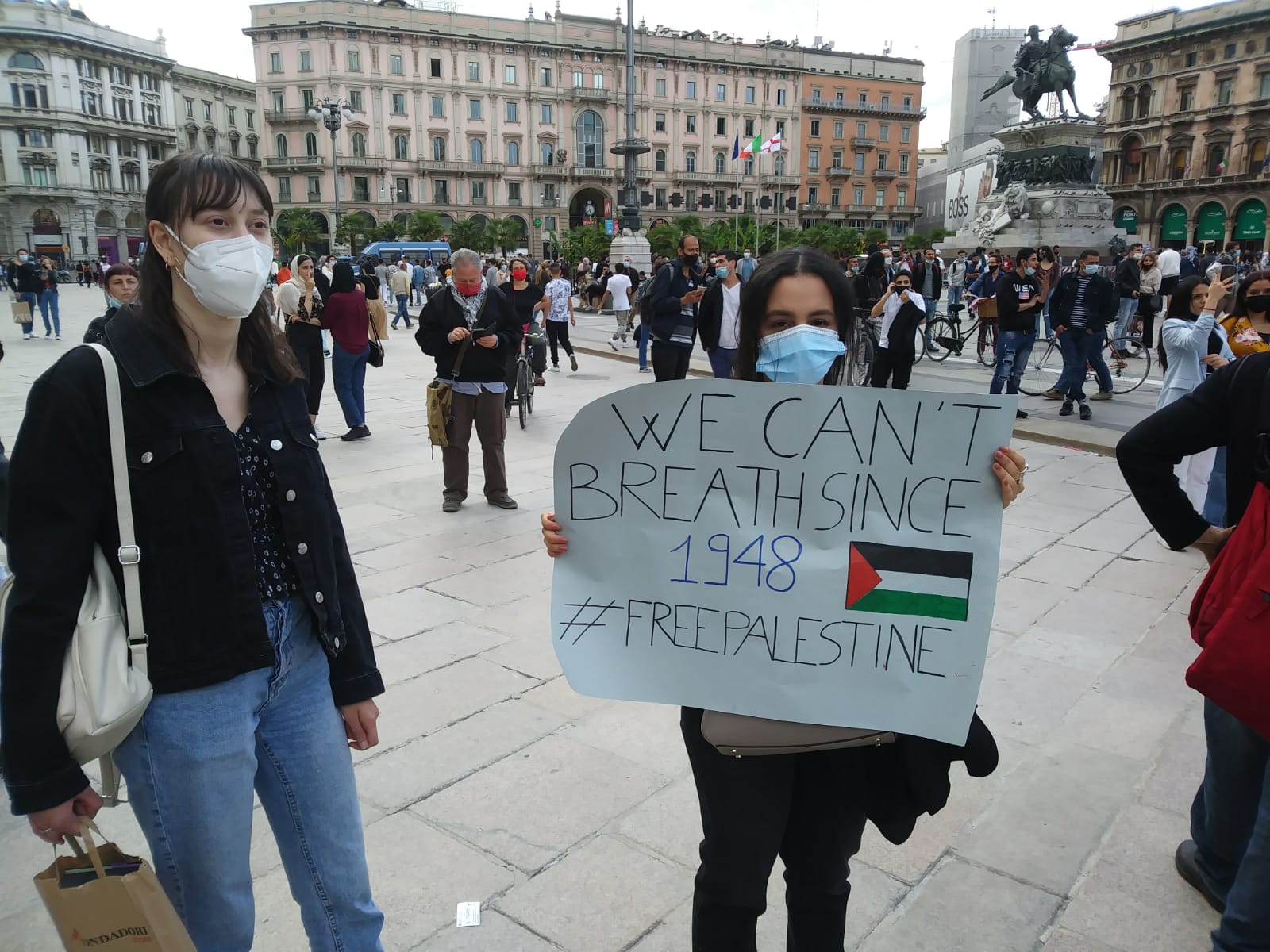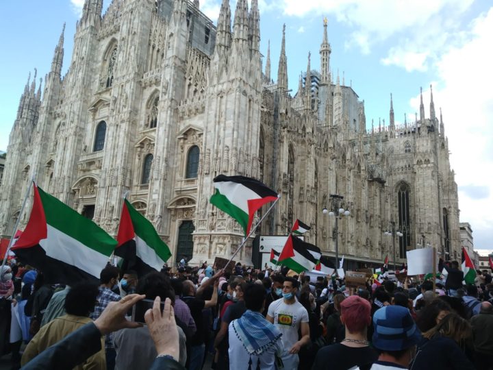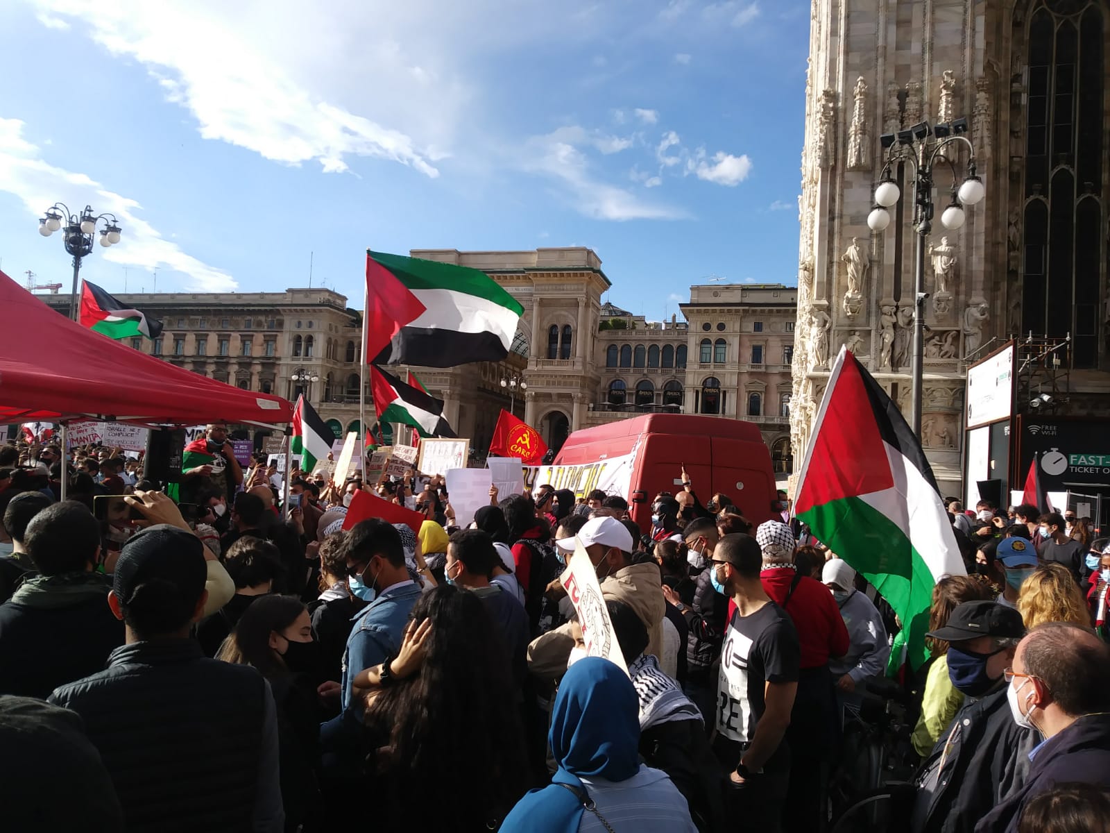 Presidio a Milano per la Palestina. Alle 17 e 30, ora di convocazione, c’è già moltissima gente. Per oltre due ore una parte di piazza Duomo sarà strapiena. Ci saranno almeno 4.000 persone, la stragrande maggioranza giovani e giovanissimi: ragazzi e ragazze del mondo arabo, tante bandiere, tanti striscioni fatti in casa, molti cartelli in buona parte scritti in inglese. Sono loro i protagonisti: i giovani di seconda o terza generazione, pare che i “loro social” abbiano funzionato, la notizia ha circolato.