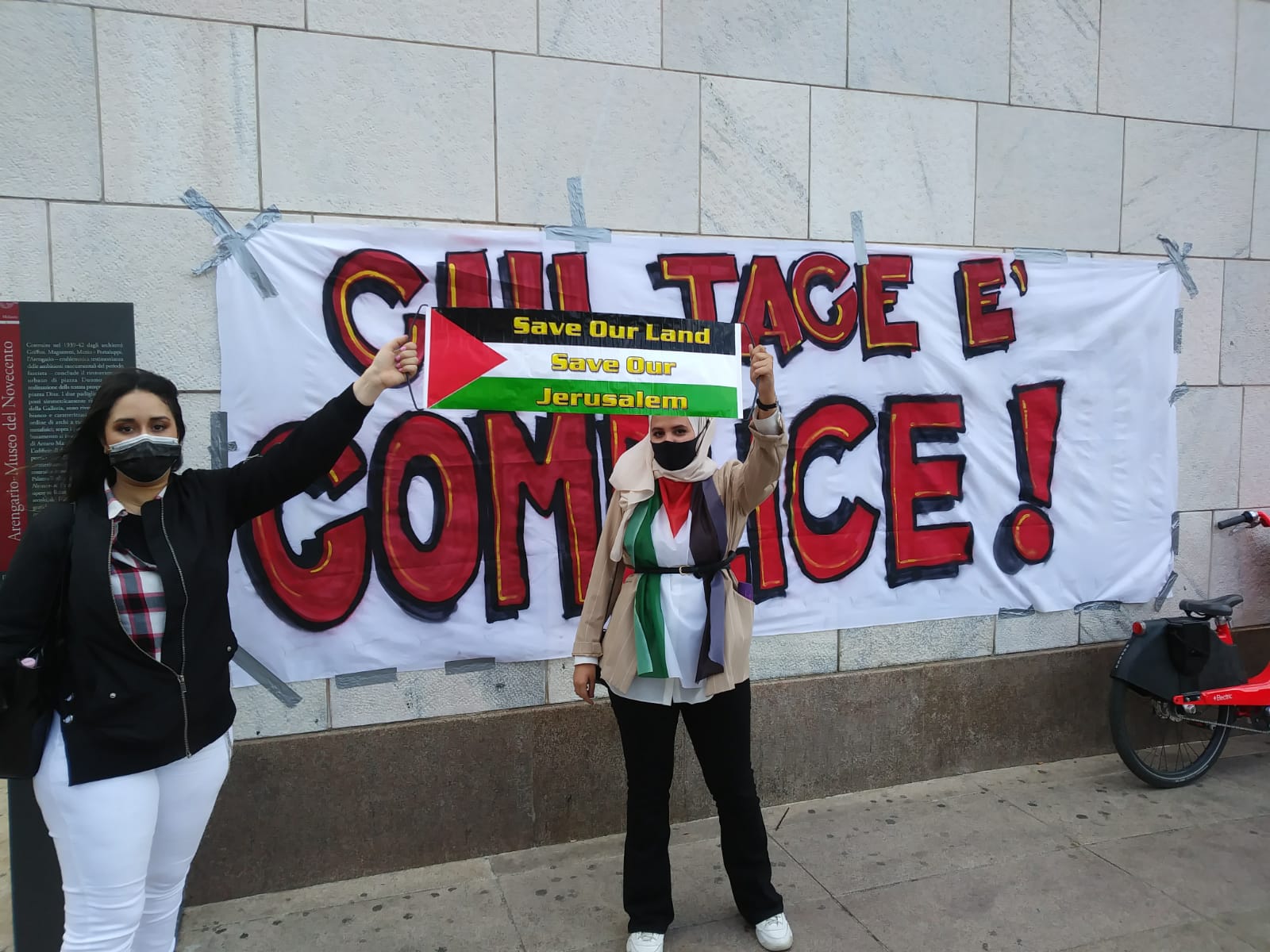 Niente palco, ma ci sono un furgone, un gazebo, un buon impianto: non si vede chi parla, ma anche qui sono giovani, soprattutto ragazze, a intervenire. Giovani palestinesi che in perfetto italiano spiegano quello che vivono, quello che vive il loro popolo, chiedono giustizia, solidarietà, attaccano la politica del governo israeliano, gridano “Vergogna” ai politici europei e italiani e ai media mainstream.